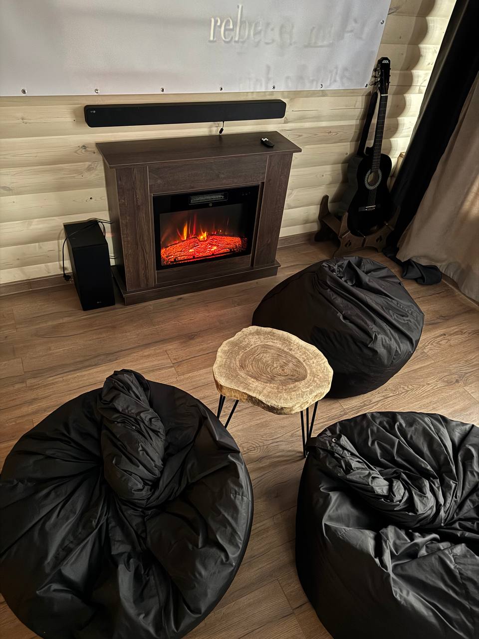 Также уютная комната с электрическим камином, проектором, диваном и кресло-мешками для ваших ретритов, медитаций и других мероприятий. Условия обговариваются отдельно.